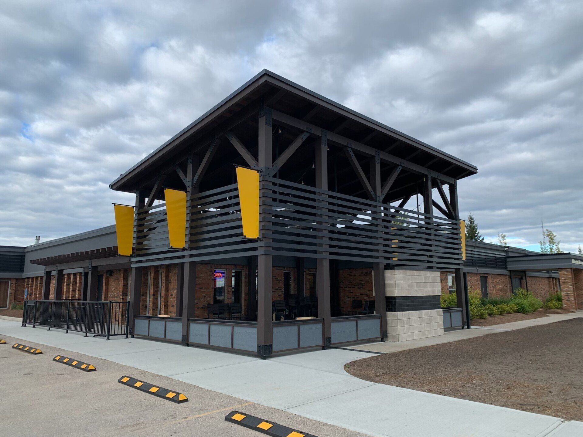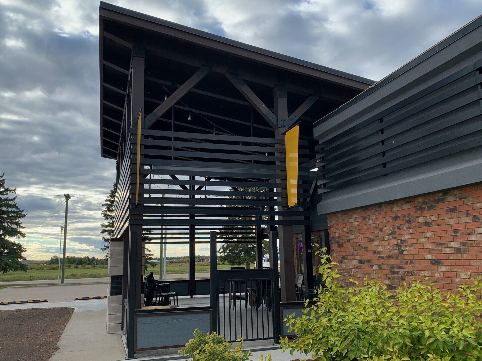 This modest addition to the Bonnyville Neighbourhood Inn provides the hotel’s popular restaurant with an opportunity for outdoor seating and an enhanced urban presence. Our design considered not only the inn’s initial desire for an outdoor patio expansion that could accommodate patrons into the early fall, but sought to add value by addressing its location at a prominent intersection at the edge of the town so that it acts as a landmark “beacon” and signals its presence as a socially active place.