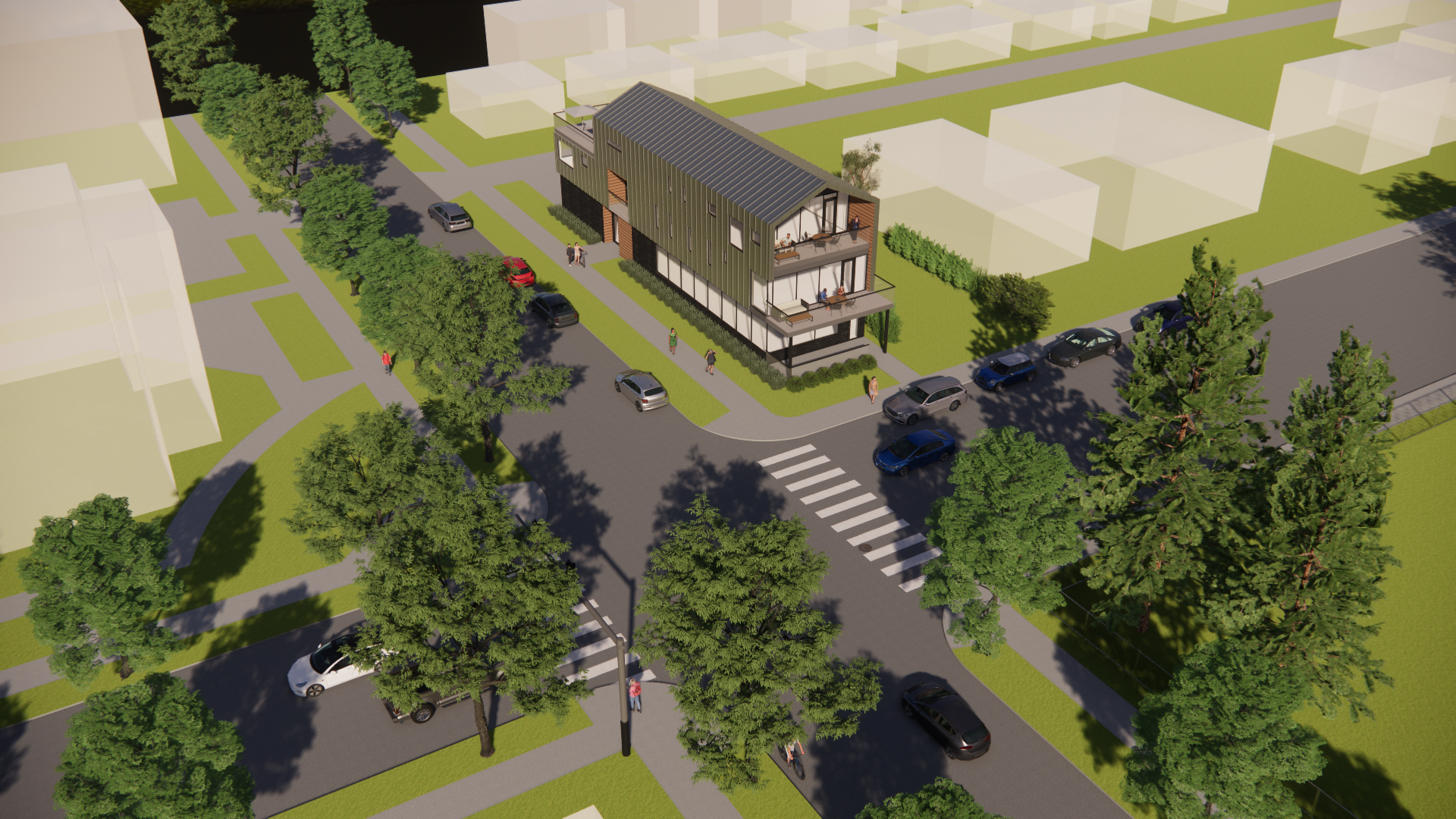 This small infill project entails a main and basement floor commercial office with three dwelling units on the upper floors, and seeks to make a positive but sensitive impact within a diversifying, historically residential mature neighbourhood. The project takes advantage of its prominent location along a busy roadway and green space frontage by orienting itself along a strong north-south axis, clearly articulating its stacked uses while taking cues from the existing neighbourhood fabric.