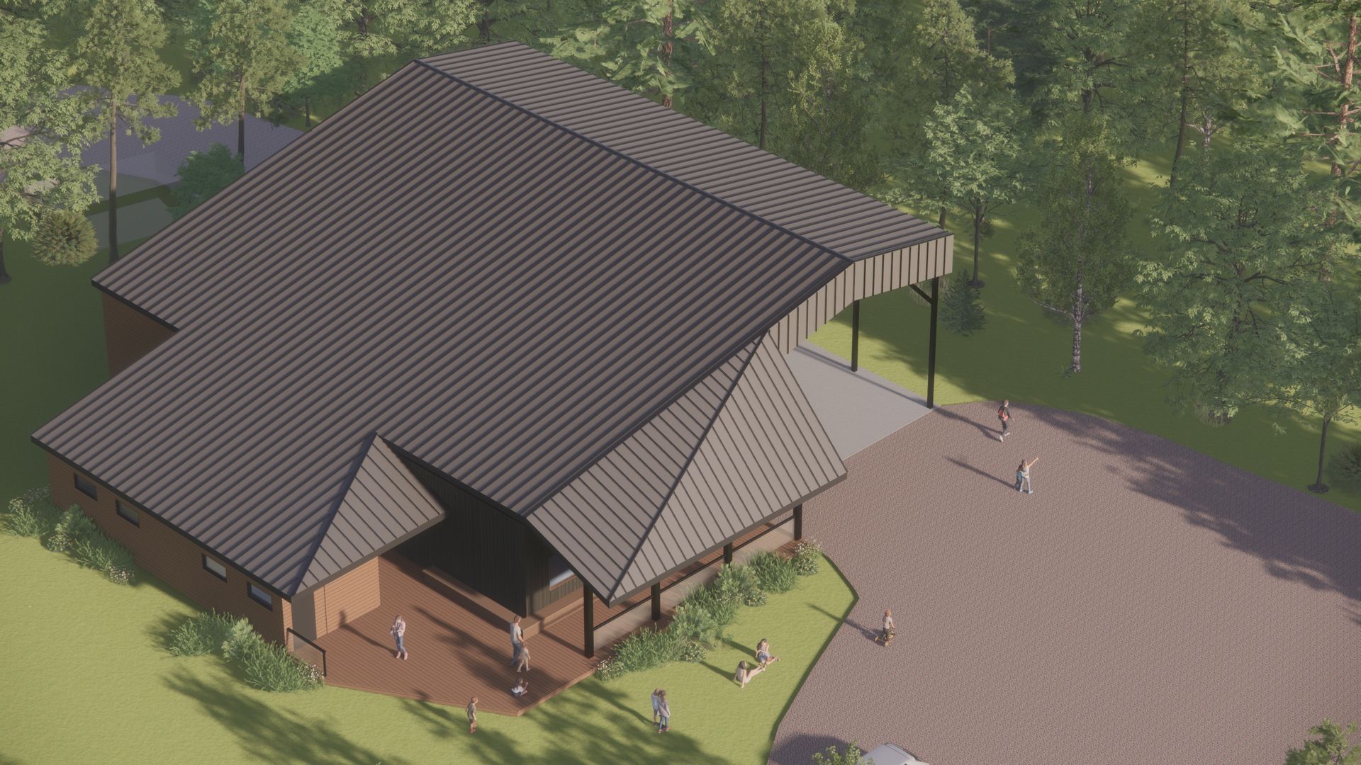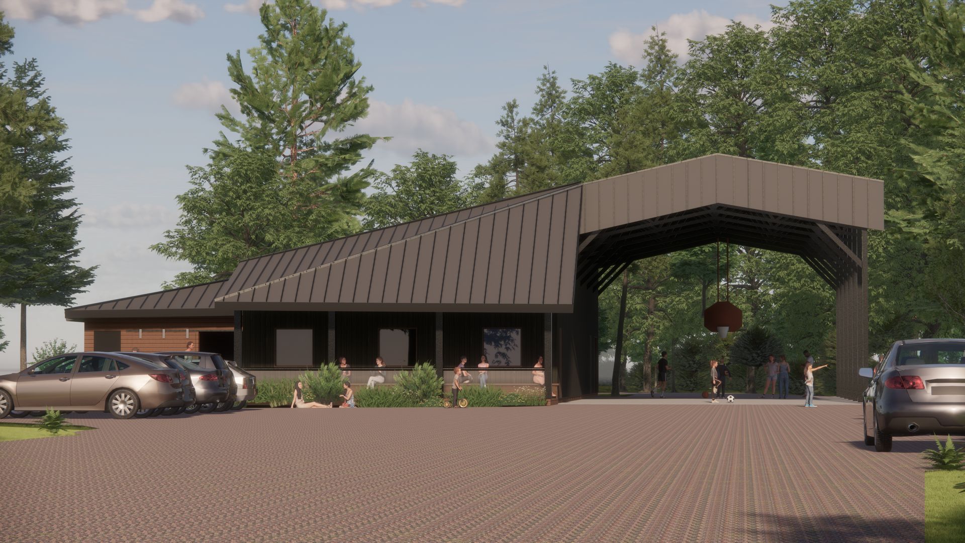Our proposal for the new unheated pool shelter (which now extends over the basketball court) takes cues from the building’s prominent location at the terminus of the gravel approach road into the heart of the camp, and creates a covered “porch” to welcome guests. It further reorients the pool entry to face the existing established social centre of the camp site, fostering a greater sense of community and activity.